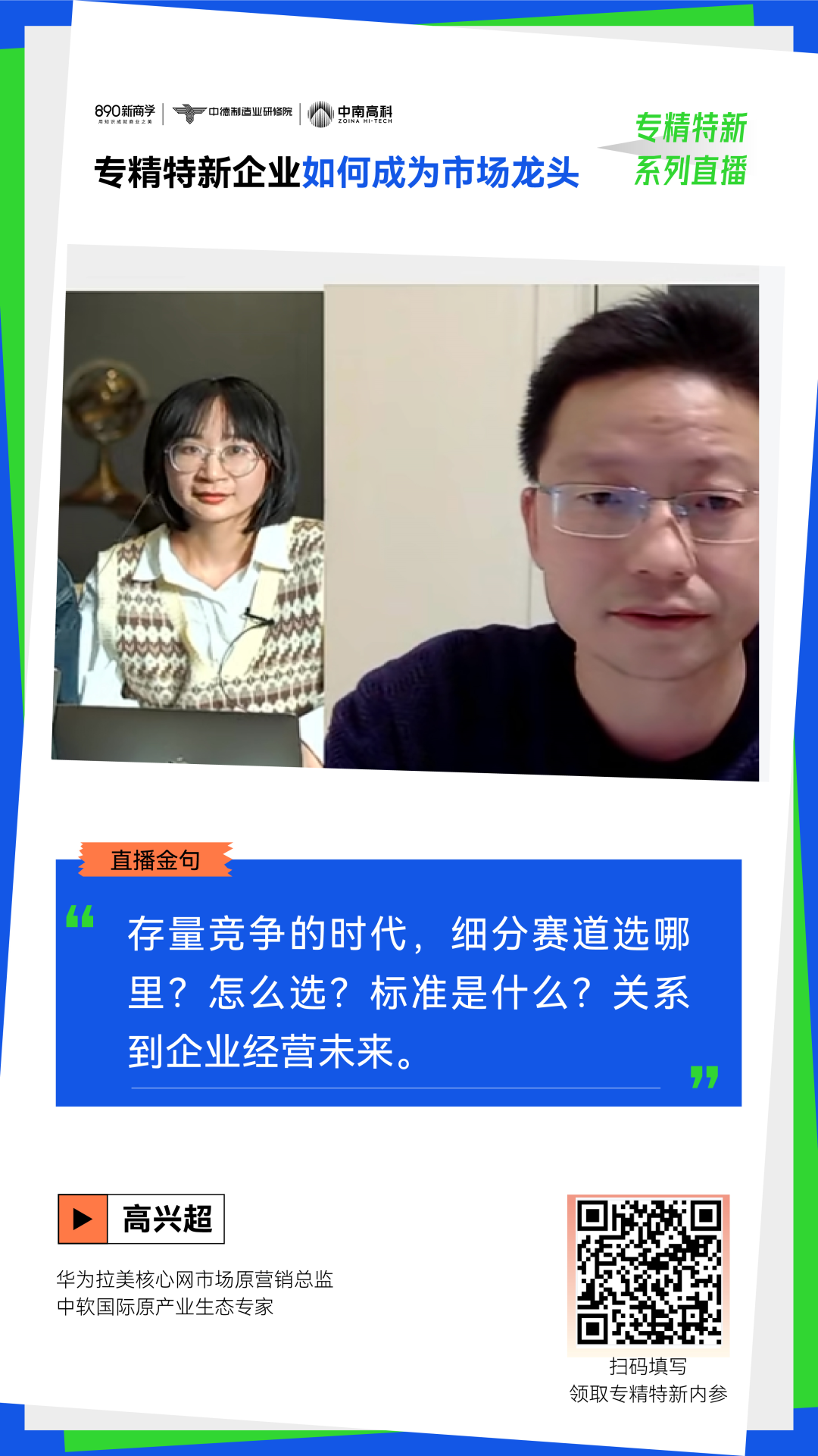 10月14日晚,我们邀请到了华为市场营销专家、中软国际产业互联网专家高兴超老师,带来《专精特新企业如何成为市场龙头》的直播课程。
