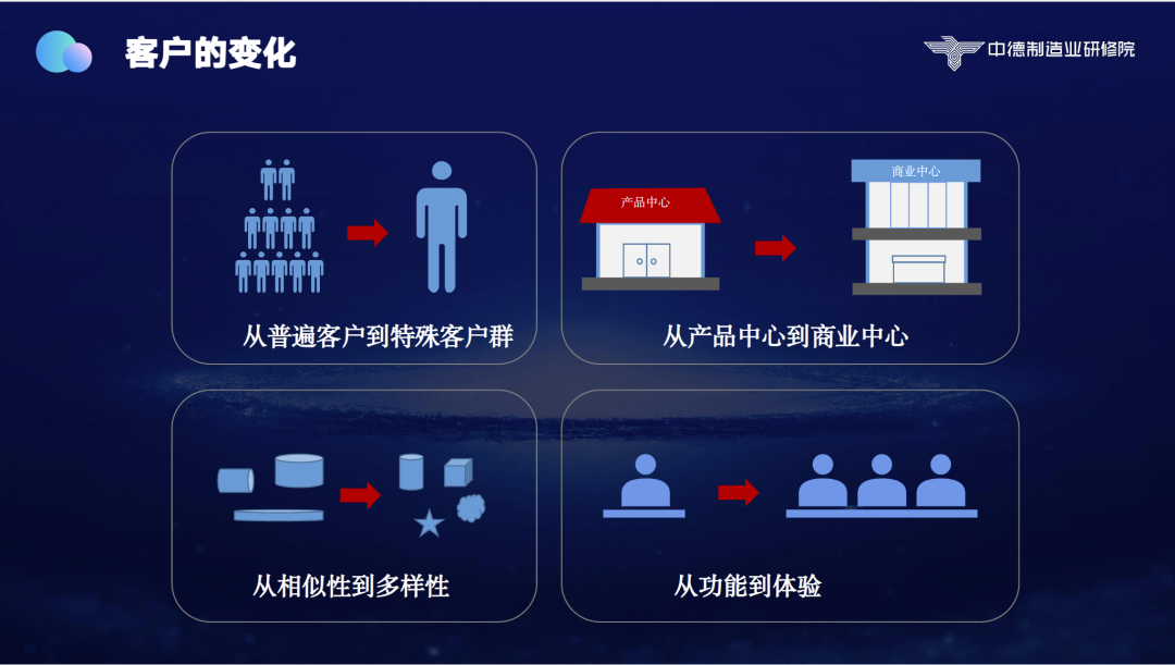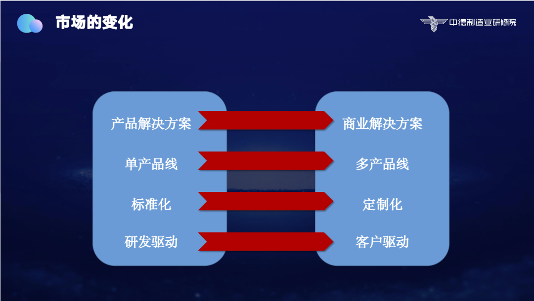第二,从产品中心到商业中心,客户购买产品的盈利预期、投资回报率没有了,他不知道投资能不能把钱赚回来,所以客户给你谈商业、谈投资回报、谈运营。一个很典型的例子,以前我们买东西只见技术部门、财务部门就可以了,但现在不行,我们要和市场部门、运营部门去谈如何产生价值。这是一个非常大的变化。