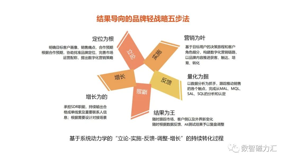 对此,我们首创了了基于品牌定位和量化思维的“品牌轻战略五步法”,推动实现从品牌战略到数字化营销、从差异化竞争优势挖掘到落地实施反馈的价值增长闭环,可以说,这对于我们业务推进的清晰度和透析度都是前所未有的。