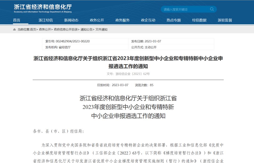 浙江省经信厅关于组织浙江省2023年度创新型中小企业和专精特新中小企业申报遴选工作的通知